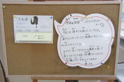 今日の卵スープには、こんぶが細く切って入れてありました。こんぶは海藻の中のひとつです。こんぶは、長いさおのような道具を使って、巻きつけてとります。収穫したこんぶは、太陽の下で干すことでうまみが増そうです。しかも、こんぶには、食物繊維や鉄分、カルシウムなどが豊富で、健康食品としても人気が高い食材です。