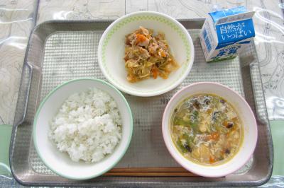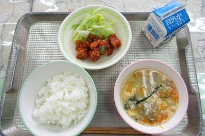 今日のメニューは、ごはん、牛乳、こんぶ入りたまごスープ、鶏肉のチリソース和え、レタスでした。