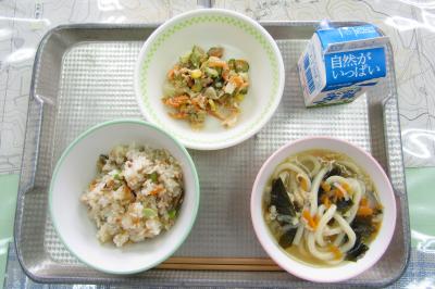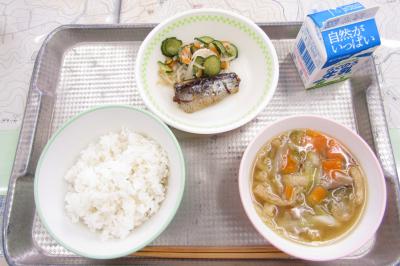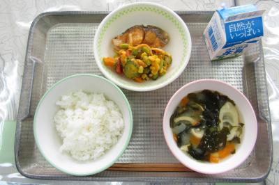 今日のメニューは、ごはん、牛乳、こさんだけの味噌汁、魚のレモン煮、かぼちゃと旬野菜のサラダでした。