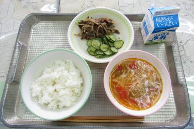 今日のメニューは、ごはん、牛乳、節そうめんのスープ、牛肉のしぐれ煮、ごまきゅうりです。