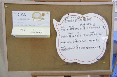 今日のメニューは、とりごぼうごはん、牛乳、きつねうどん、ごまドレッシングサラダです。今日は南関あげで作ったきつねうどんでした。