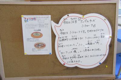 今日はアップルチーズミートローフがありました。このミートローフですが、もともとはドイツの伝統的な料理です。アメリカに伝わり、家庭料理となりました。英語の「ミート」は「肉」、「ローフ」は「塊」という意味があります。今日は、ひき肉と玉ねぎ、りんご、チーズをひとかたまりにして焼いてありました。たいへんおいしくいただきました。