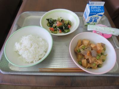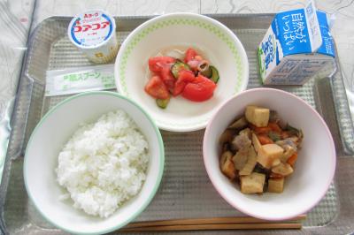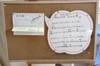 今日のメニューは、ごはん、牛乳、おかか煮、トマトの甘酢、ヨーグルトでした。今日の注目は、「おかか煮」です。おかかとは、かつおぶしのことです。今日の煮物の中にはたっぷりとおかかを入れてありました。春は、かつおが獲れる季節です。かつおぶしにすると、だしや和え物や冷ややっこなど、いろいろな料理に使うことができます。今日も、たいへんおいしくいただきました。