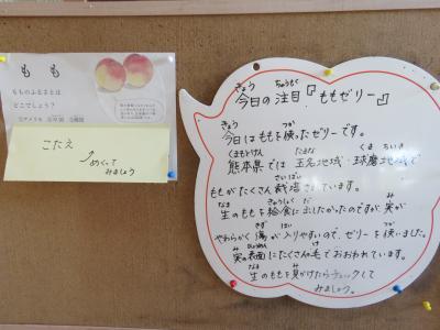 熊本県では、玉名地域や球磨地域でたくさん作られています。給食に使う缶詰は黄桃ですが、熊本県では白桃が多いです。生のももを出したかったのですが、給食センターで洗うと柔らかくて傷がついてしまうので、今日はゼリーを使いました。旬のくだものです。機会があれば食べてみてください。