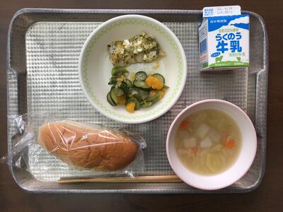 今日のメニューは、コッペパン、タンドリーチキン、きゅうりのレモンあえ、コーンチャウダー、牛乳でした。