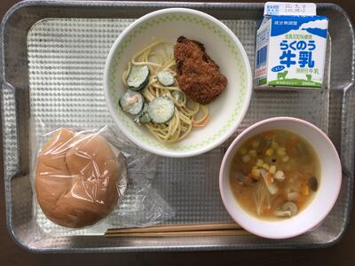 今日のメニューは、丸パン、さわらフライ、スパゲティサラダ、コンソメスープ、牛乳でした。