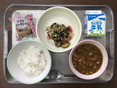 今日のメニューは、麦ごはん、南関あげのカレー、和風サラダ、デザート(ミニシュークリーム)、牛乳でした。