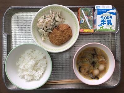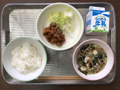 今日のメニューは、ごはん、鶏肉のチリソースあえ、小松菜と卵の中華スープ、レタス、牛乳でした。
