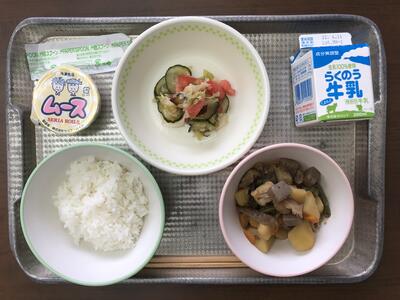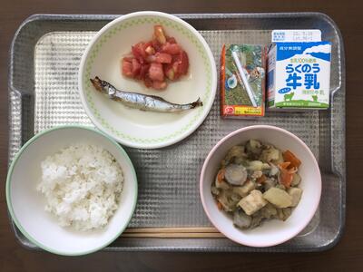 今日のメニューは、麦ごはん、ジャガイモのそぼろ煮、ししゃもの香り焼き、トマトの甘酢、牛乳、みかんジュースでした。