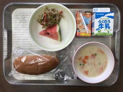 今日のメニューは、コッペパン、グリーンシチュー、ピーマンのじゃこ和え、すいか、みかんジュース、牛乳でした。