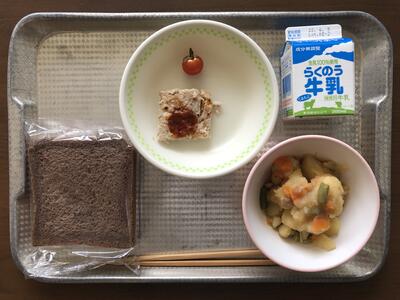 今日のメニューは、ココアパン、じゃがいものベーコン煮、アップルチーズミートローフ、ミニトマト、牛乳でした。