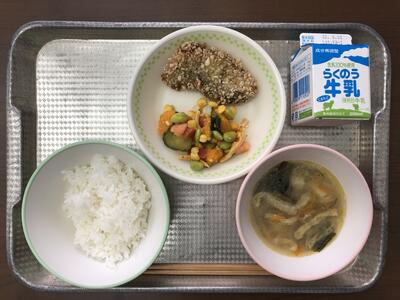 今日のメニューは、ごはん、魚の天玉揚げ、かぼちゃと旬野菜のサラダ、みそ汁、牛乳でした。