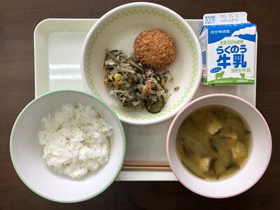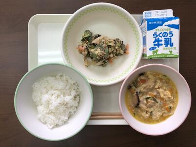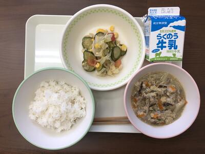 今日のメニューは、麦ごはん、魚のカレー南蛮、ごまきゅうり、豆腐とレタスのスープ、牛乳でした。