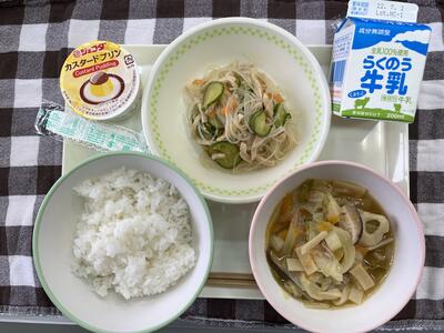 今日のメニューは、ごはん、かぼちゃのそぼろ煮、ビーフンサラダ、いりこと大豆のかりんとう、牛乳でした。