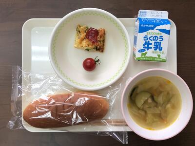 今日のメニューは、ミルクパン、チーズオムレツ、ミニトマト、野菜スープ、牛乳でした。