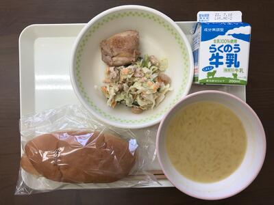 今日のメニューは、コッペパン、鶏肉のマーマレードソース焼き、カラフルコールスロー、コーンスープ、牛乳でした。