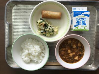 1月16日のメニューは、ご飯、マーボー豆腐、春巻き、バンバンジーサラダ、牛乳でした。