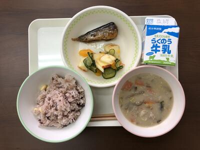 1月19日のメニューは、つなひきよいしょ、おひめさん団子汁、サンマの梅煮、菜果なます、牛乳でした。