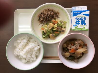 1月23日のメニューは、ご飯、豚肉と大根のべっ甲煮、魚のサラダ、手作りふりかけ、牛乳でした。