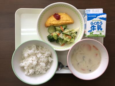 クリームシチューは、日本で考え出され、給食で広まったそうです。給食センターでは、市販のルウは使わず、手作りのルウで作ってあります。そう言われてみれば、家で食べるシチューと少し味が違うような気もします。サラサラであっさりした食べ応えでした。大皿のおかずも含めて、色あいの美しいメニューでした。