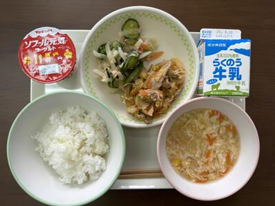 豚キムチは、ごはんにのせて丼にしました。給食なので辛みはほんのちょっと。でも、きちんと香辛料の後味が残りました。キムチは乳酸菌が豊富な発酵食品なので、お腹の調子を整える働きがあります。今日は、ヨーグルトとのダブル効果で、お腹に花丸の献立でした。今日もおいしくいただきました。