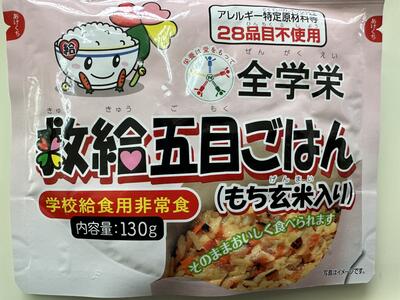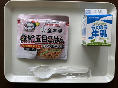 牛乳と合わせて、通常の給食の半分程度のカロリーでした。家庭では災害に備えてローリングストック等も考えておきたいですね。