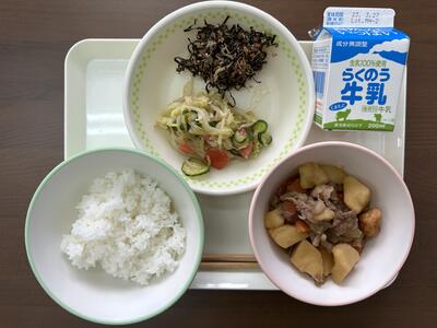 肉じゃがは給食ではよく見られますが、大量に作るからか、味がよくなじんでとてもおいしいです(もちろん、調理の腕がいいのです)。肉は、関東では豚肉、関西では牛肉と聞いたことがあります。カレーも確かそうですね。今日は、牛肉の肉じゃがでした。今日もおいしくいただきました。