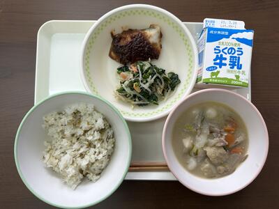 3月17日のメニューは、高菜ごはん、白玉だんご汁、魚の田楽風、ほうれん草のごま和え、牛乳でした。