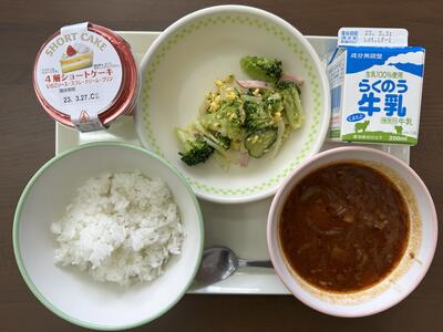 3月20日のメニューは、ハヤシライス、ミモザサラダ、デザート、牛乳でした。