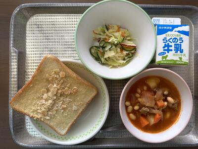 3月22日、今年度最後の給食は、アーモンドトースト、ピークビーンズ、フレンチサラダ、牛乳でした。