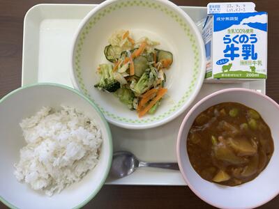 今日のメニューは、チキンカレー、グリーンサラダ、牛乳でした。