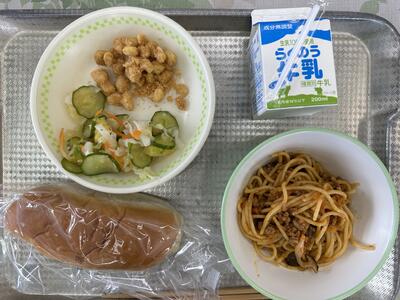 麺好きの私にはうれしいスパゲティミートソースでした。ひき肉と細かく刻んだ野菜で作ったソースが、給食なので麺にからめてありました。麺がちょうどいいゆで具合でした。きなこ豆は、大豆を揚げてあるので独特の食感でした。今日もおいしくいただきました。