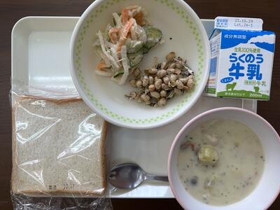 今日のメニューは、食パン、秋野菜のシチュー、大根とササミのサラダ、いりこと大豆のりんかけ、牛乳でした。