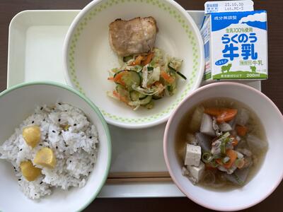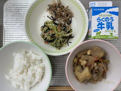 今日のメニューは、麦ご飯、さといものみそ汁、アジ入りさんが、ごま和え、牛乳でした。