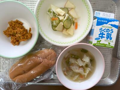 今日のメニューは、コッペパンカット、ポトフ、ドライカレー、キャベツとリンゴのサラダ、牛乳でした。