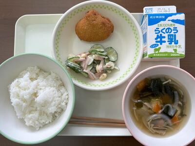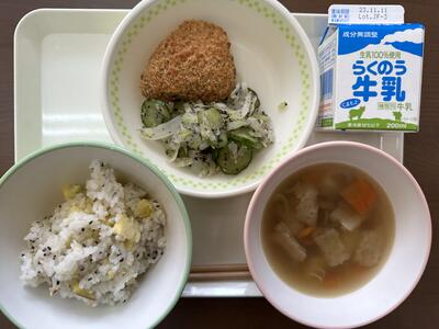 今日のメニューは、ご飯、肉団子汁、栗コロッケ、サラダ、牛乳でした。
