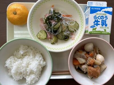 今日のメニューは、ご飯、おでん、春雨の酢の物、みかん、牛乳でした。