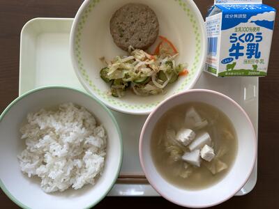 今日のメニューは、ご飯、はんぺん汁、大豆と豆腐のフライ、ひじきと切り堀大根の和え物、牛乳でした。