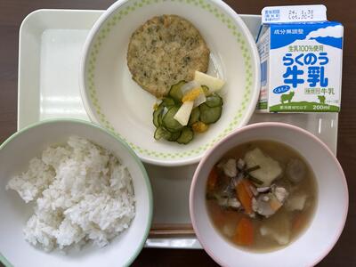 今日のメニューは、麦ご飯、お姫さんだんご汁、大豆と豆腐のフライ、菜果なます、牛乳でした。