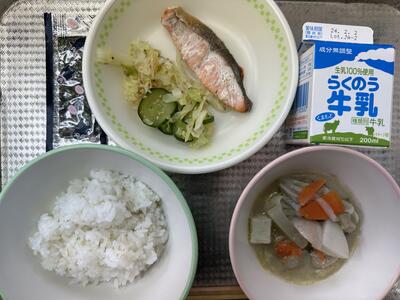 今日のメニューは、麦ご飯、具だくさんみそ汁、鮭の塩焼き、野菜と漬物の和え物 一食のり、牛乳でした。