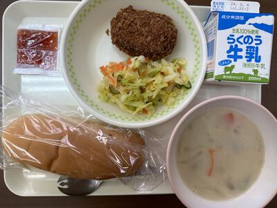 今日のメニューは、コッペパン、豆乳スープ、くじらメンチカツ、キャベツの甘酢和え、いちごジャム、牛乳でした。
