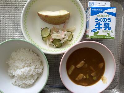 今日のメニューは、麦ご飯、カレー、だいこんサラダ、りんご、牛乳でした。