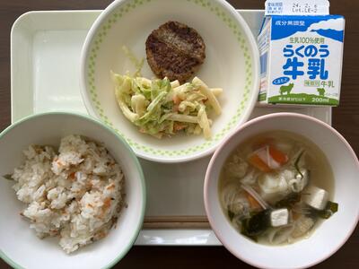 今日のメニューは、南関あげのまぜご飯、節そうめん汁、イワシ入りハンバーグ、マカロニサラダ、牛乳でした。