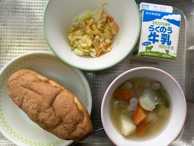 今日のメニューは、揚げパン、ポトフ、コールスローサラダ、牛乳でした。