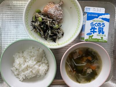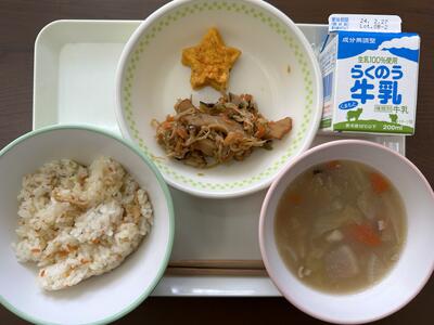 今日のメニューは、しょうがご飯、トマトだんご汁、豆腐のしんじょ、切り干し大根の炒め煮、牛乳でした。