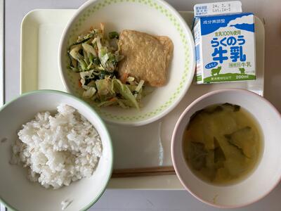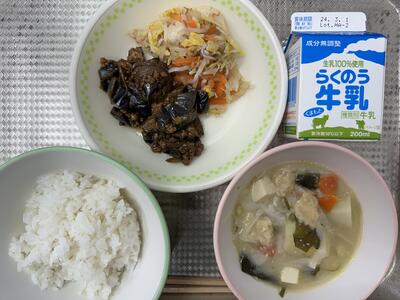 今日のメニューは、麦ご飯、節そうめんのみそ汁、なすの肉味噌、白菜のおかか和え、牛乳でした。