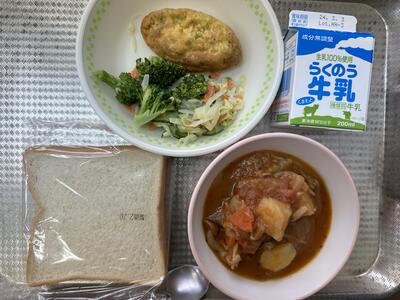 ハヤシライスの名前の由来は諸説ありますが、この物価高騰の折に牛肉のメニューを給食で食べられるのはありがたいと思いました。子どもたちの食べるのを見ていたら、意外と枝豆やパプリカが苦手な子がいて、苦労していたようです。給食はさまざまな食材を食べる体験の場でもあります。今日もおいしくいただきました。