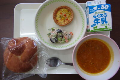 今日のメニューは、ひのくにパン、かぼちゃのポタージュ、キッシュ、ビーンズサラダ、牛乳でした。