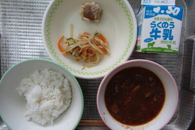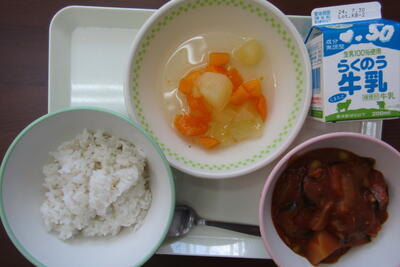 今日のメニューは、夏野菜カレー、フルーツジュレ、牛乳でした。