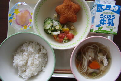 今日のメニューは、麦ご飯、魚そうめん汁、星型コロッケ、イタリアンサラダ、七夕ゼリー、牛乳でした。